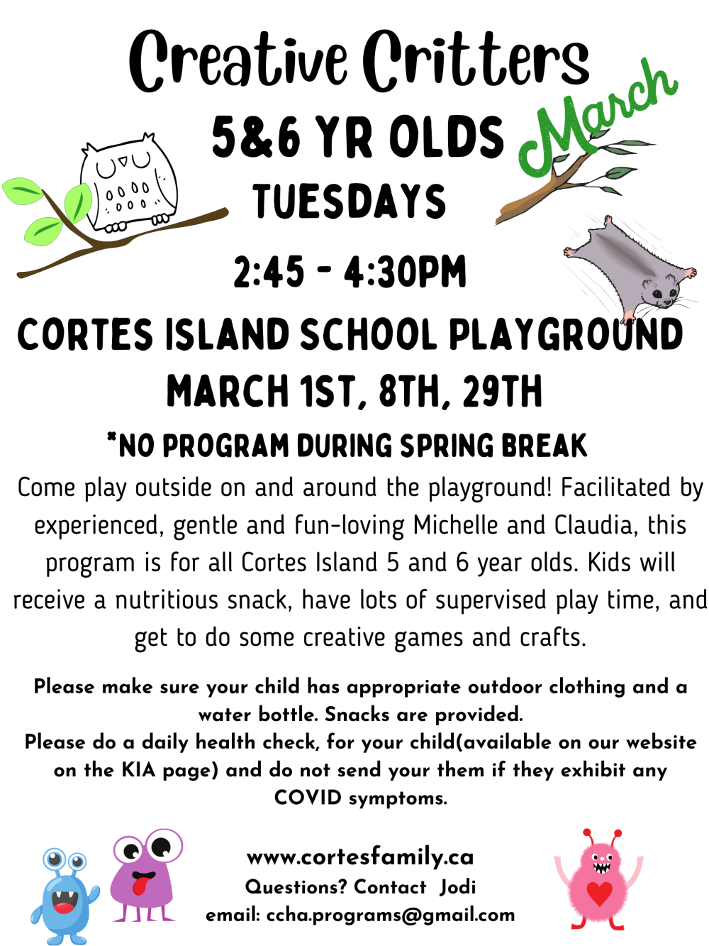 Iβm so excited to introduce you to our newest CCHA Youth Program β Creative Critters! This afterschool program is for all Cortes Island Youth ages 5 and 6 years old. This is a wonderful way for kids to connect whether they attend school or are homelearners.